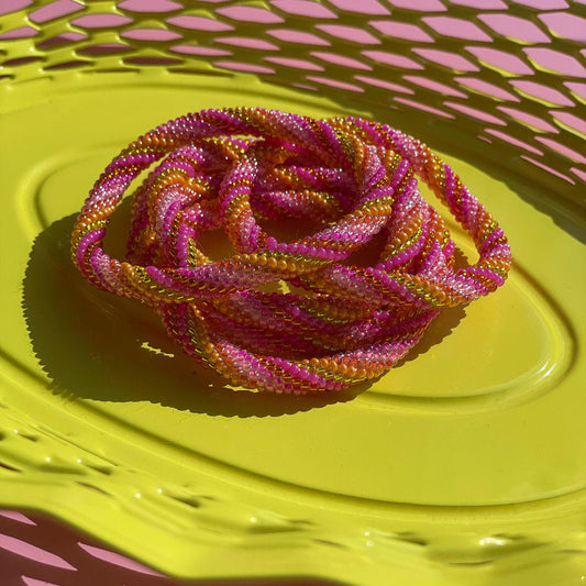 Vores Nepal armbånd er omhyggeligt håndlavet af nepalesiske håndværkere, der syr glasperler sammen med stærk bomuldssnor. Armbåndene rulles let på armen og tilpasser sig de fleste håndled, hvilket gør dem både behagelige og stilfulde – perfekte som en unik gaveidé eller som en tilføjelse til din personlige smykkesamling.