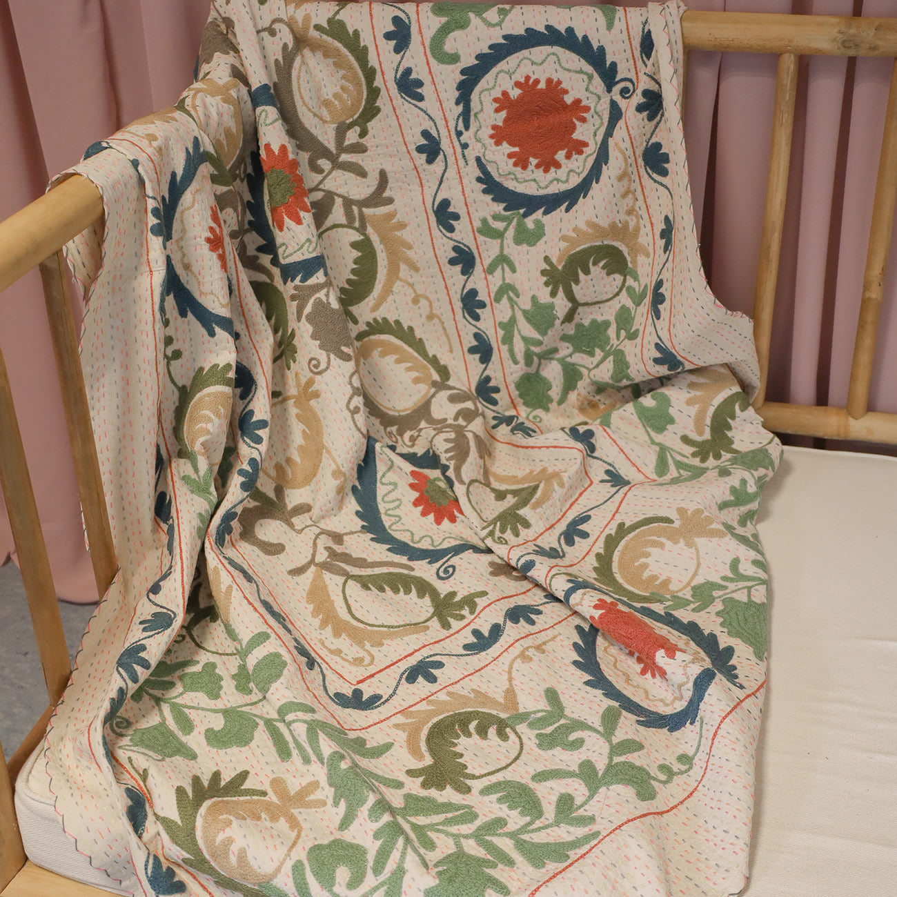 Adede tæppet er udsmykket med de smukkeste indiske suzani mønstre. Tæpperne er unikke, så der findes kun ét eller meget få af hver. Adede tæppet kan både bruges som sengetæppe eller plaid i stuen.