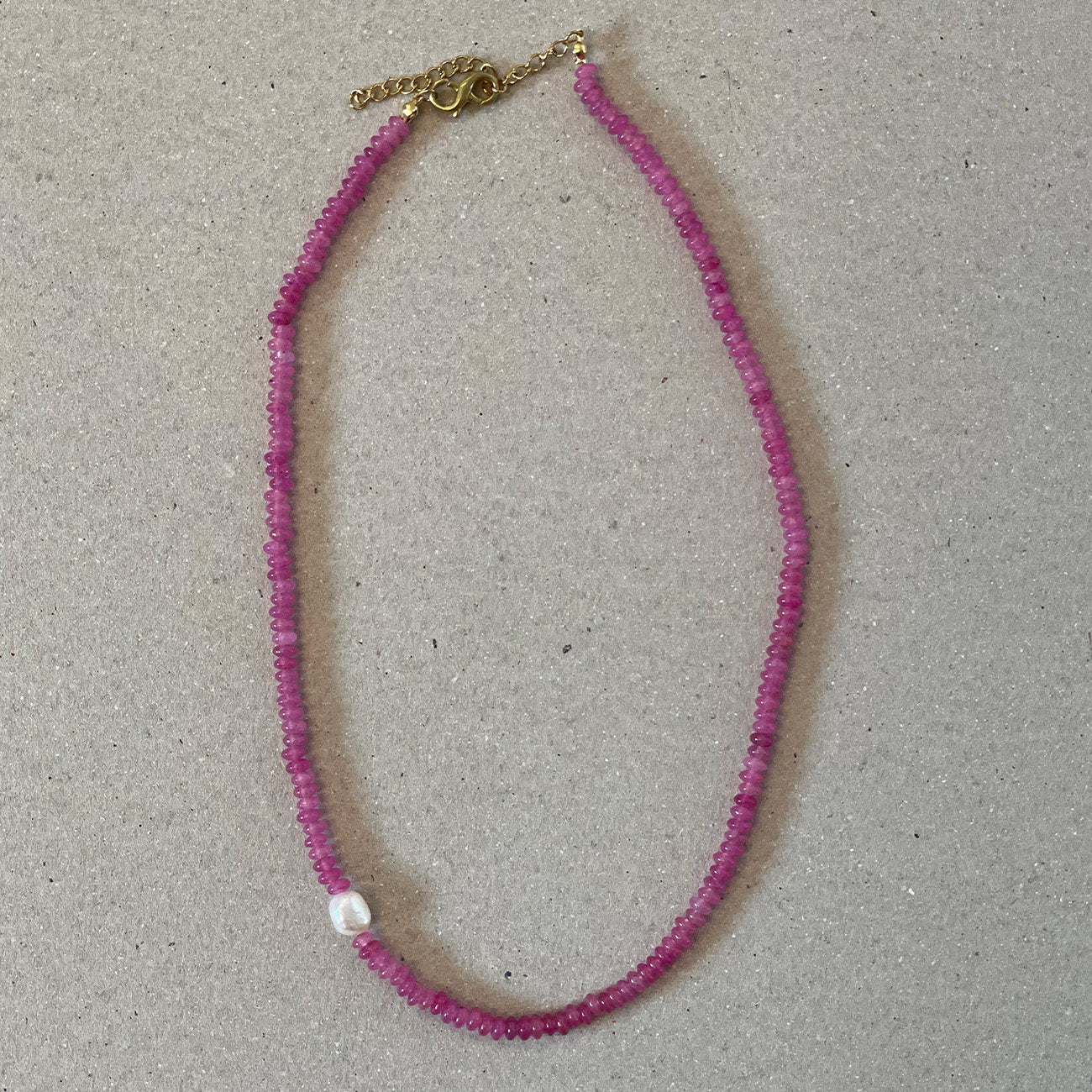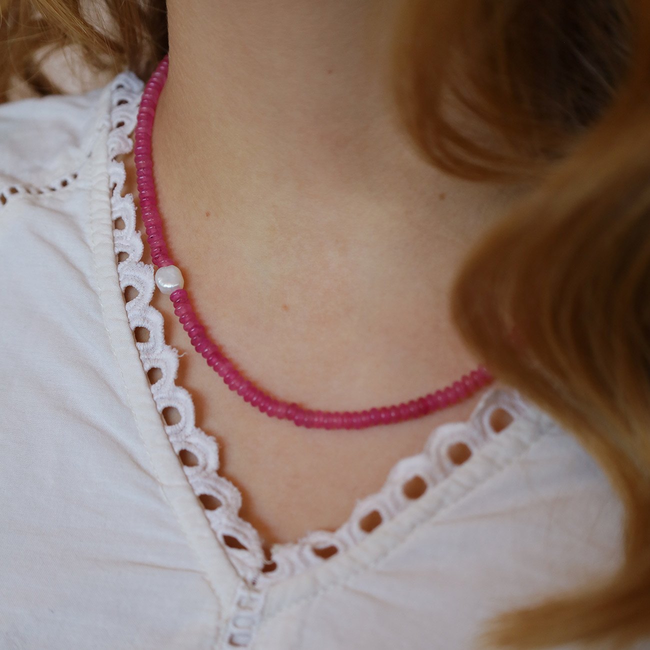 Anitta halskæde er udsmykket med små farverige perler og en enkelt ferskvandsperle.