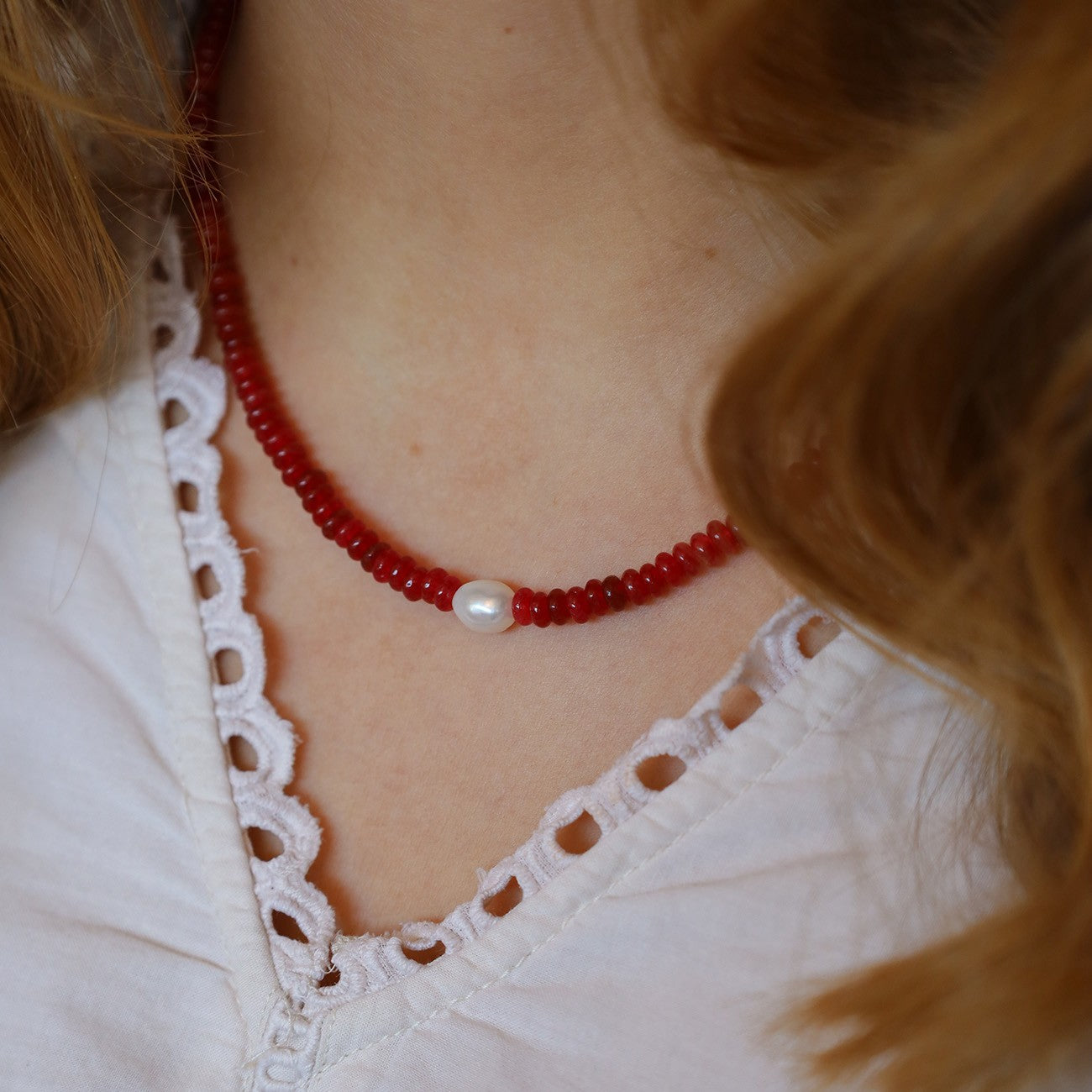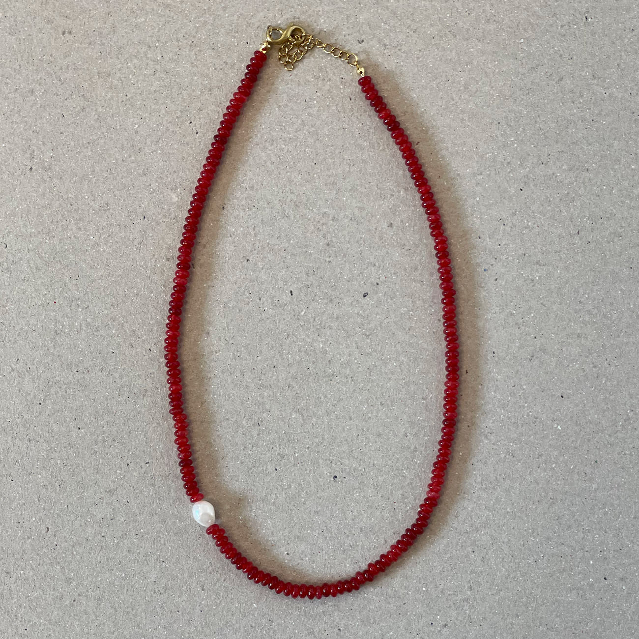Anitta halskæde er udsmykket med små farverige perler og en enkelt ferskvandsperle.
