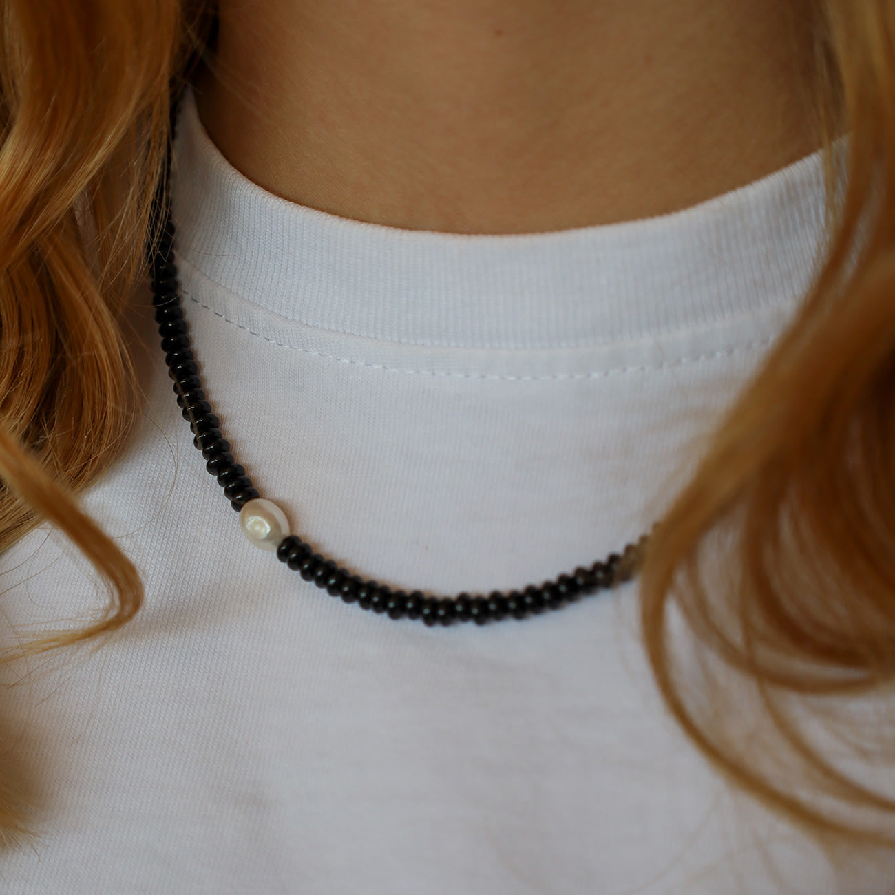 Anitta halskæde er udsmykket med små farverige perler og en enkelt ferskvandsperle.