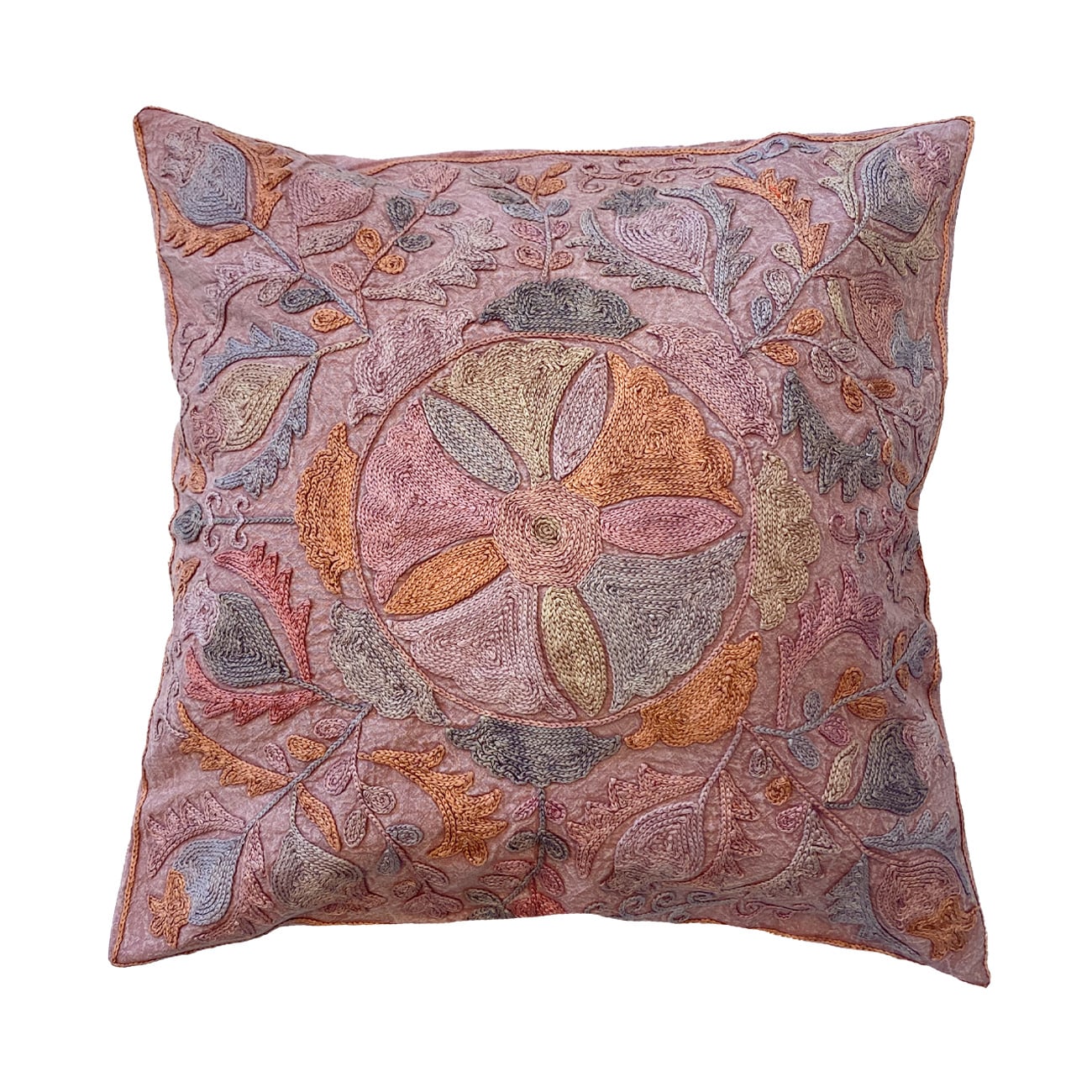 Vores Camilla suzani pudebetræk fås med rosa og brun grundfarve, hvorpå de er pyntet med de smukkeste suzani broderier i skønne farver. Pudebetrækkene er unikke, så der findes kun ét af hvert pudebetræk.