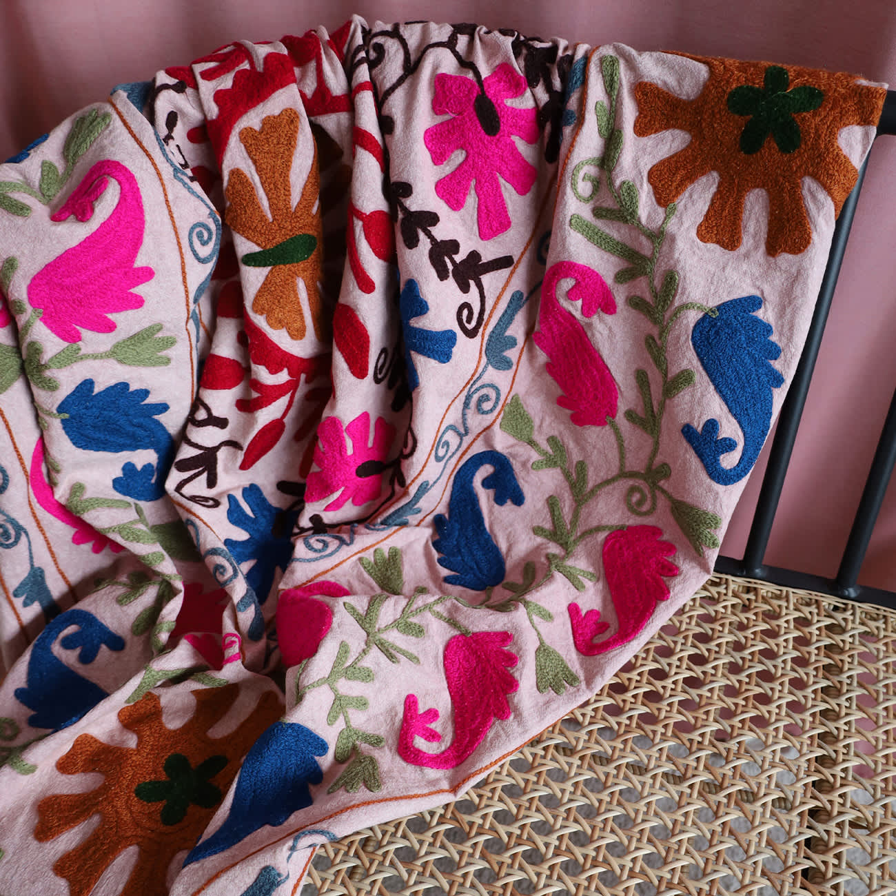 Eloise tæppet er udsmykket med de smukkeste indiske suzani mønstre. Tæpperne er unikke, så der findes kun ét eller meget få af hver. Adede tæppet kan både bruges som sengetæppe eller plaid i stuen.