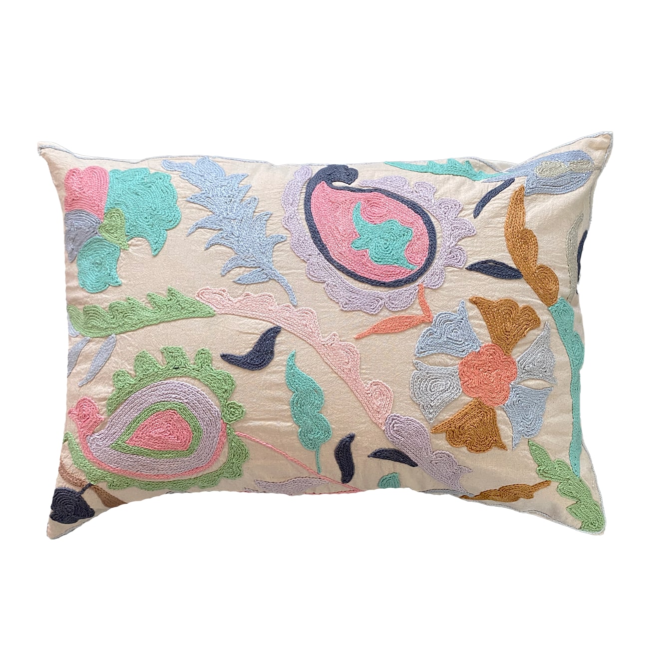 Vores Fananda suzani pudebetræk måler 40 x 60 cm og er håndbroderet med de smukkeste farverige suzani-mønstre, som er en indisk broderimetode. Alle pudebetræk er unikke, så der findes kun ét af hver.