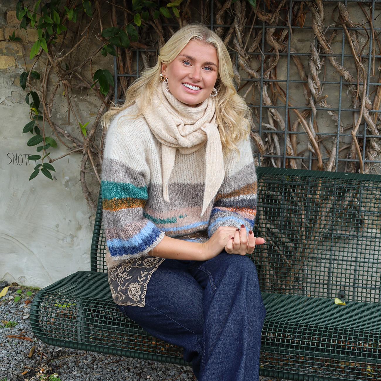 Kliva er et stort trekantet tørklæde i strik, som holder dig varm i de kolde måneder samtidig med, at det tilføjer en fin detalje til dit outfit.