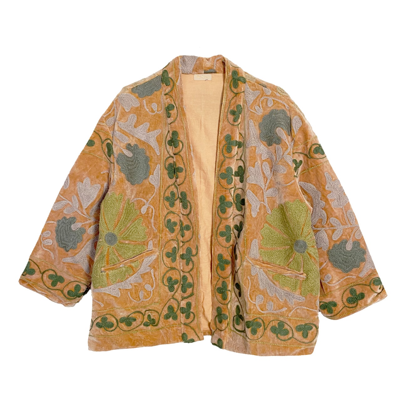 Vores Manett velour jakke er udsmykket med de fineste suzani mønstre i forskellige farver. Hver jakke er unik, så der findes kun én af hver.