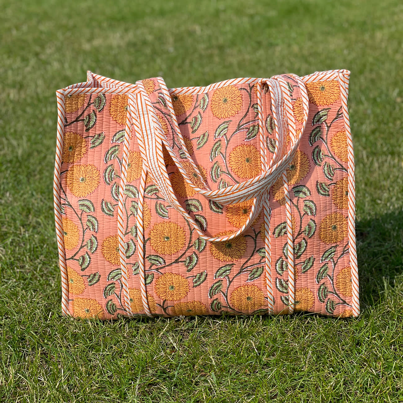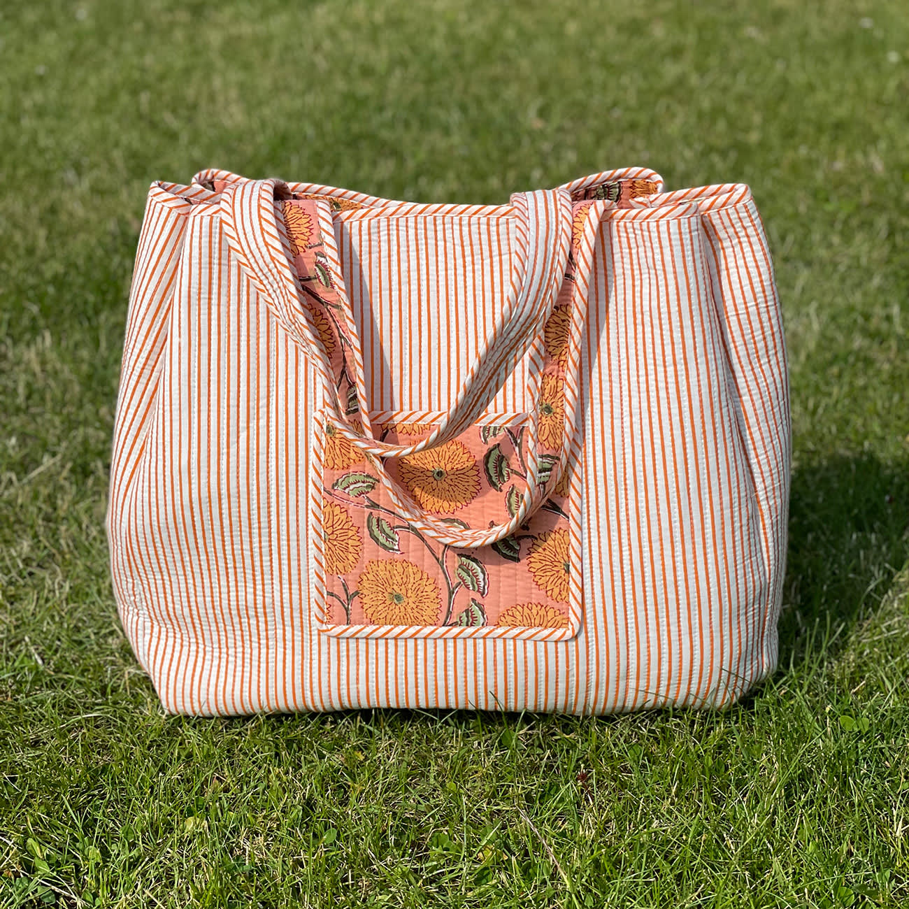 Vores Mille taske er et stort og rummelig net uden lukning. Tasken er vendbare med forskellige mønstre/farver på inderside og yderside.