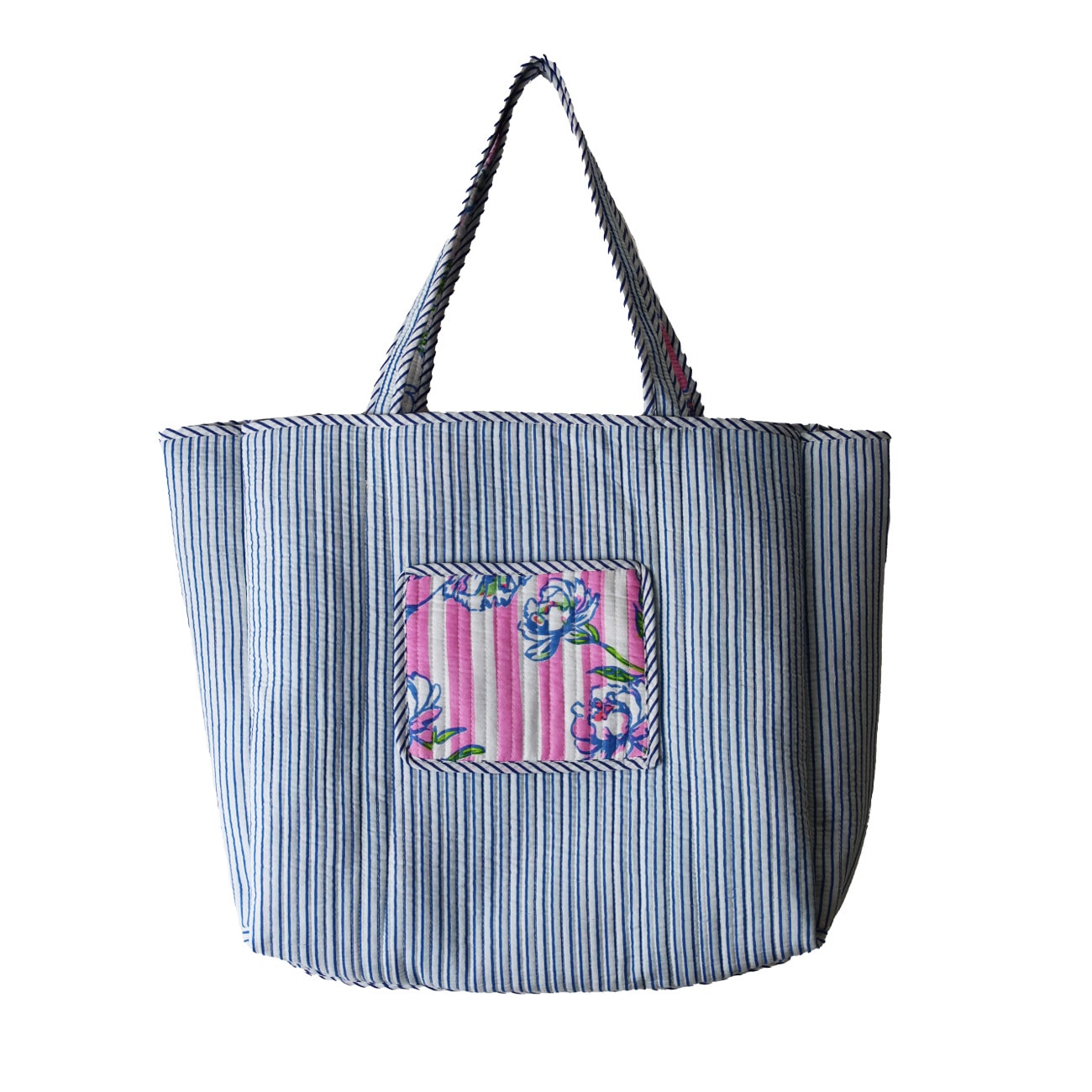Vores Mille taske er et stort og rummelig net uden lukning. Tasken er vendbare med forskellige mønstre/farver på inderside og yderside.