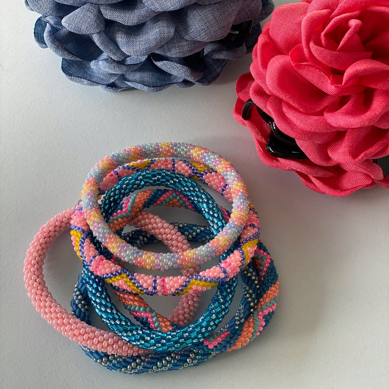 Nepal armbåndet er håndlavet af små flotte glasperler, der er broderet med bomuldsgarn. Armbåndene er smukke at style enkeltvis eller med en sammensætning af flere armbånd. De er onesize og skal rulles over hånden, da de ikke har en lukning.
