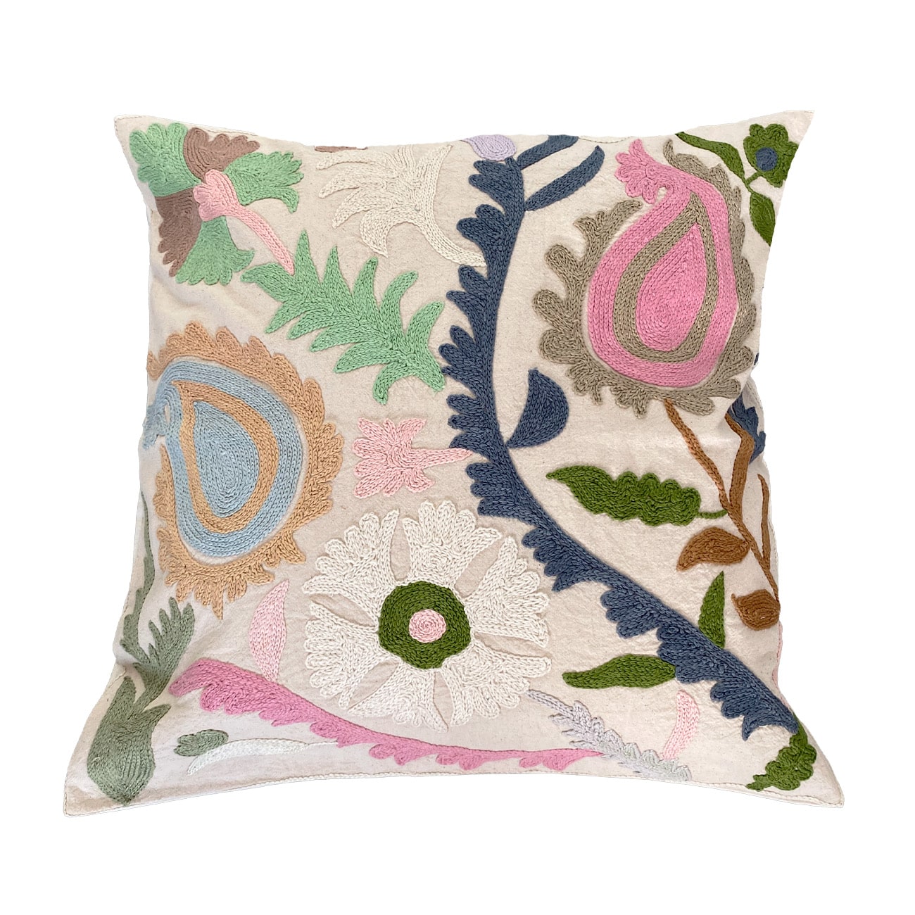 Vores Roberta suzani pudebetræk måler 50 x 50 cm og er håndbroderet med de smukkeste farverige suzani-mønstre, som er en indisk broderimetode. Alle pudebetræk er unikke, så der findes kun ét af hver.