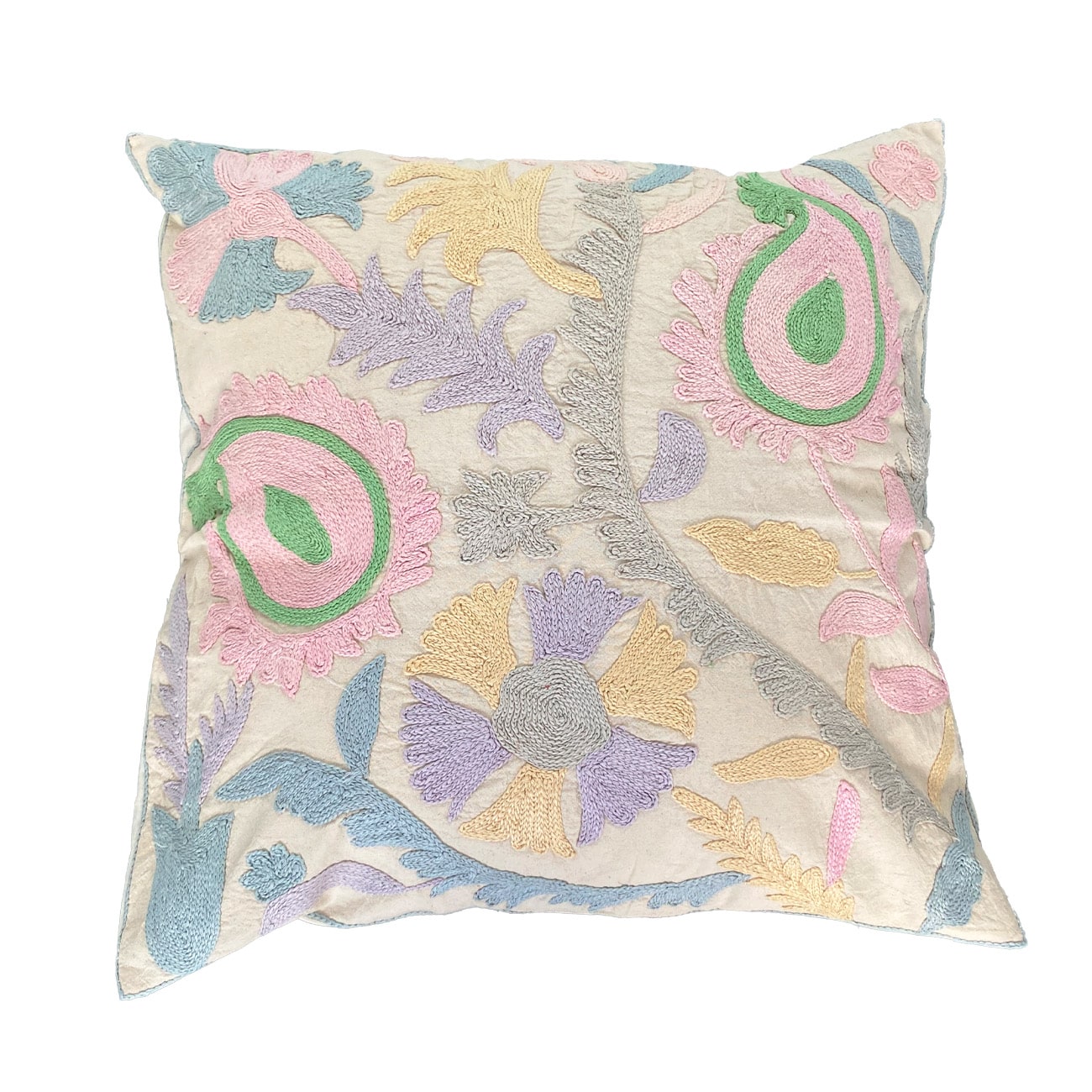 Vores Roberta suzani pudebetræk måler 50 x 50 cm og er håndbroderet med de smukkeste farverige suzani-mønstre, som er en indisk broderimetode. Alle pudebetræk er unikke, så der findes kun ét af hver.