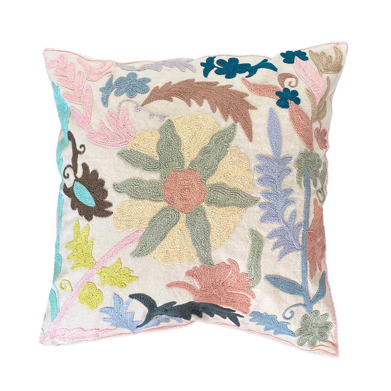 Vores Roberta suzani pudebetræk måler 50 x 50 cm og er håndbroderet med de smukkeste farverige suzani-mønstre, som er en indisk broderimetode. Alle pudebetræk er unikke, så der findes kun ét af hver.