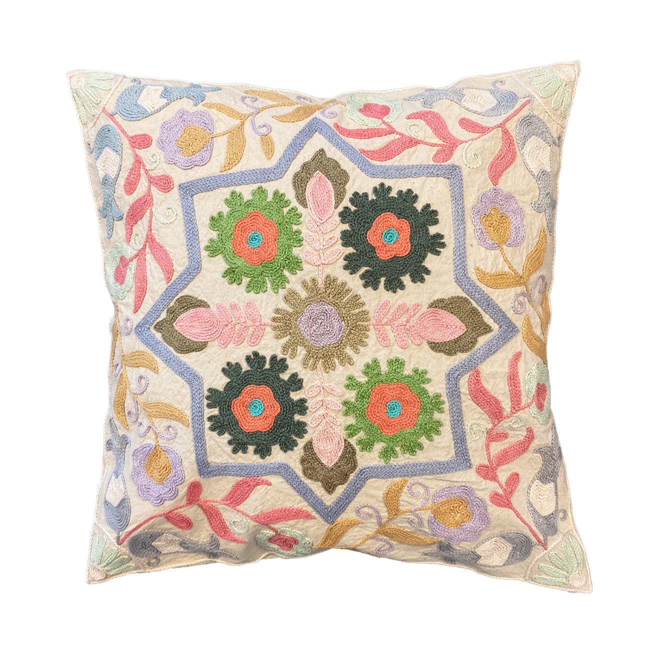 Vores Roberta suzani pudebetræk måler 50 x 50 cm og er håndbroderet med de smukkeste farverige suzani-mønstre, som er en indisk broderimetode. Alle pudebetræk er unikke, så der findes kun ét af hver.
