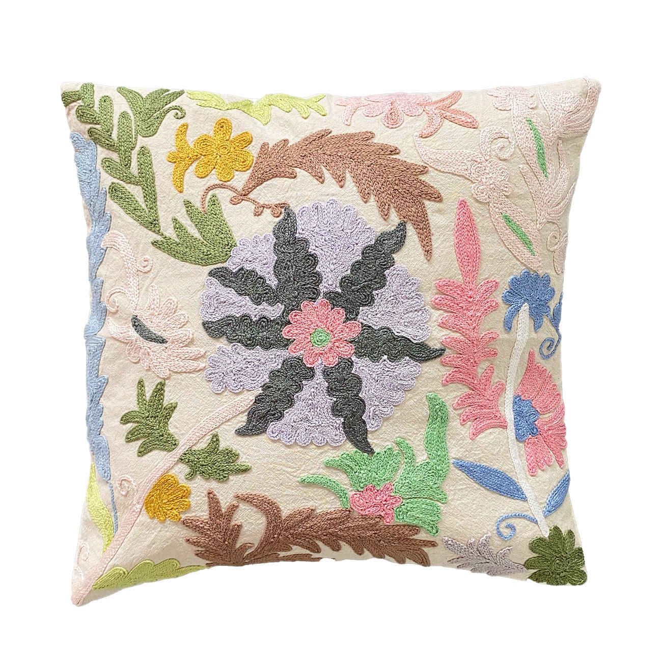 Vores Roberta suzani pudebetræk måler 50 x 50 cm og er håndbroderet med de smukkeste farverige suzani-mønstre, som er en indisk broderimetode. Alle pudebetræk er unikke, så der findes kun ét af hver.
