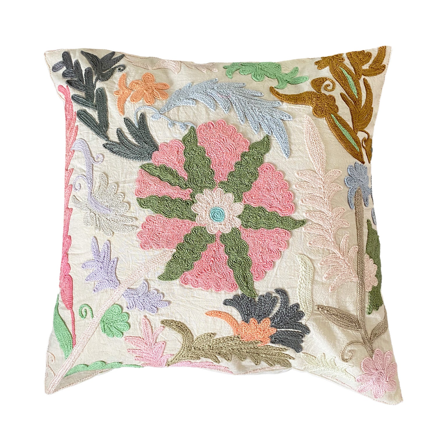 Vores Roberta suzani pudebetræk måler 50 x 50 cm og er håndbroderet med de smukkeste farverige suzani-mønstre, som er en indisk broderimetode. Alle pudebetræk er unikke, så der findes kun ét af hver.