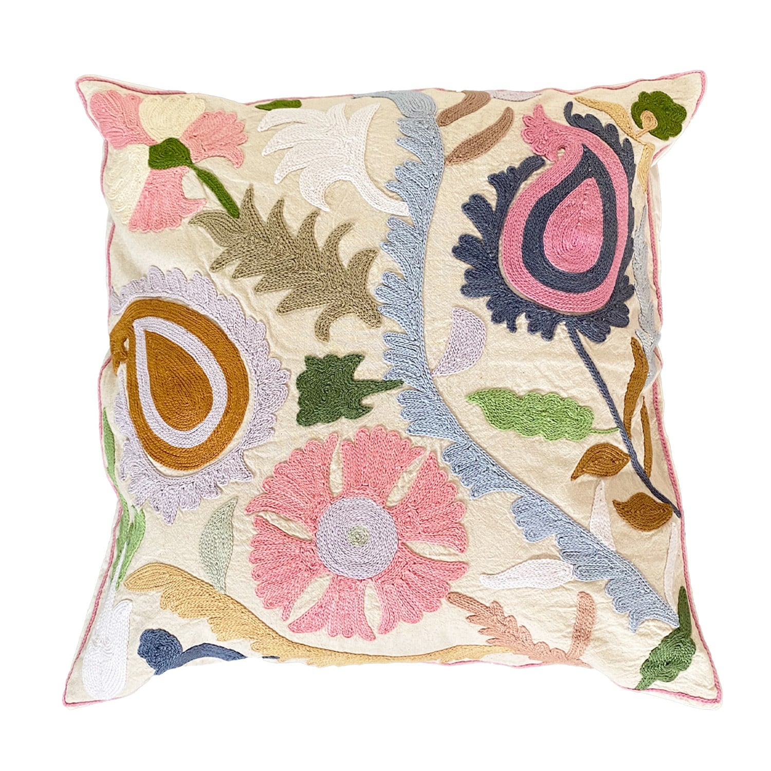 Vores Roberta suzani pudebetræk måler 50 x 50 cm og er håndbroderet med de smukkeste farverige suzani-mønstre, som er en indisk broderimetode. Alle pudebetræk er unikke, så der findes kun ét af hver.