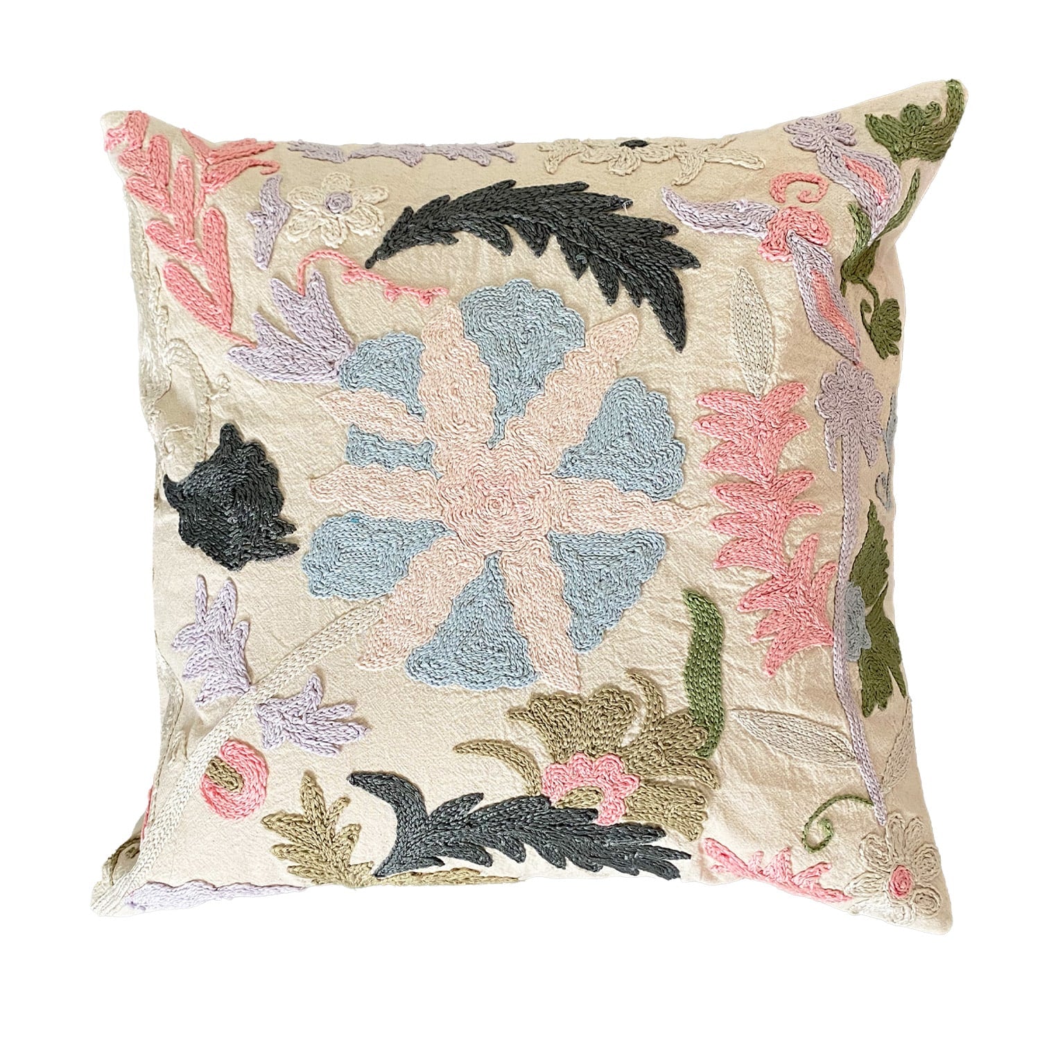 Vores Roberta suzani pudebetræk måler 50 x 50 cm og er håndbroderet med de smukkeste farverige suzani-mønstre, som er en indisk broderimetode. Alle pudebetræk er unikke, så der findes kun ét af hver.