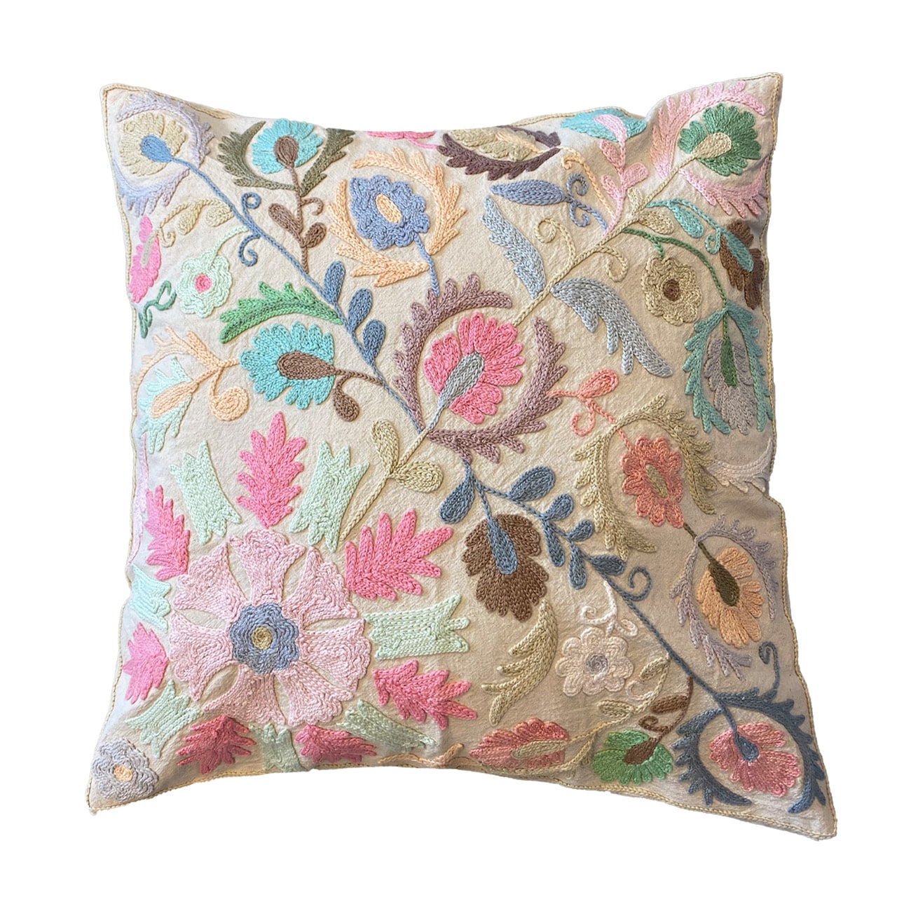 Vores Roberta suzani pudebetræk måler 50 x 50 cm og er håndbroderet med de smukkeste farverige suzani-mønstre, som er en indisk broderimetode. Alle pudebetræk er unikke, så der findes kun ét af hver.