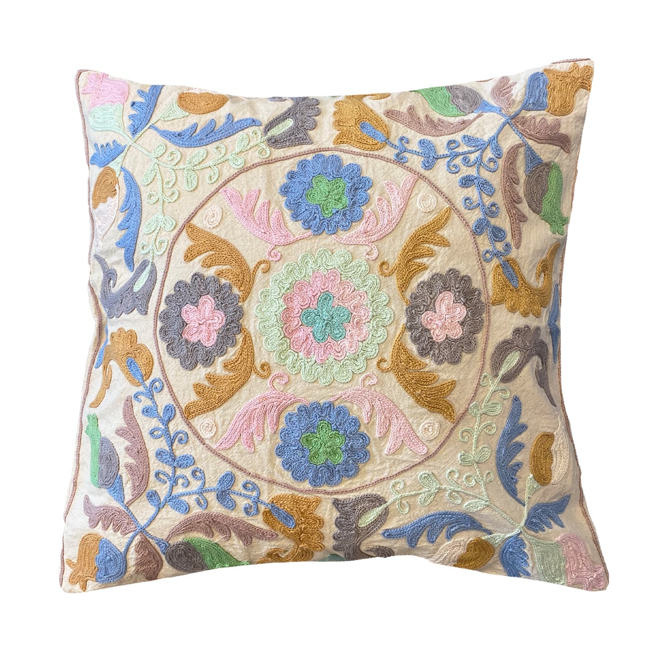 Vores Roberta suzani pudebetræk måler 50 x 50 cm og er håndbroderet med de smukkeste farverige suzani-mønstre, som er en indisk broderimetode. Alle pudebetræk er unikke, så der findes kun ét af hver.