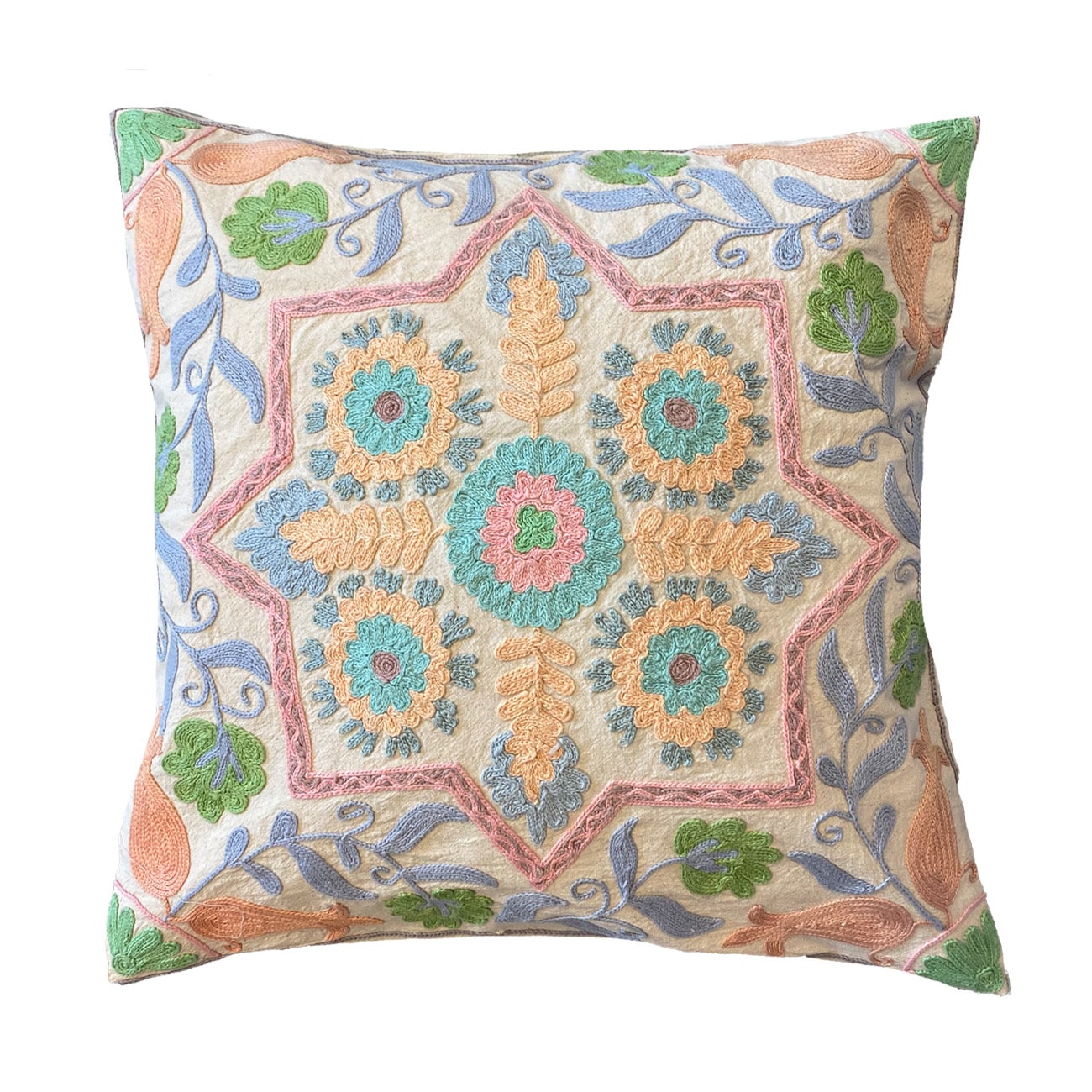 Vores Roberta suzani pudebetræk måler 50 x 50 cm og er håndbroderet med de smukkeste farverige suzani-mønstre, som er en indisk broderimetode. Alle pudebetræk er unikke, så der findes kun ét af hver.