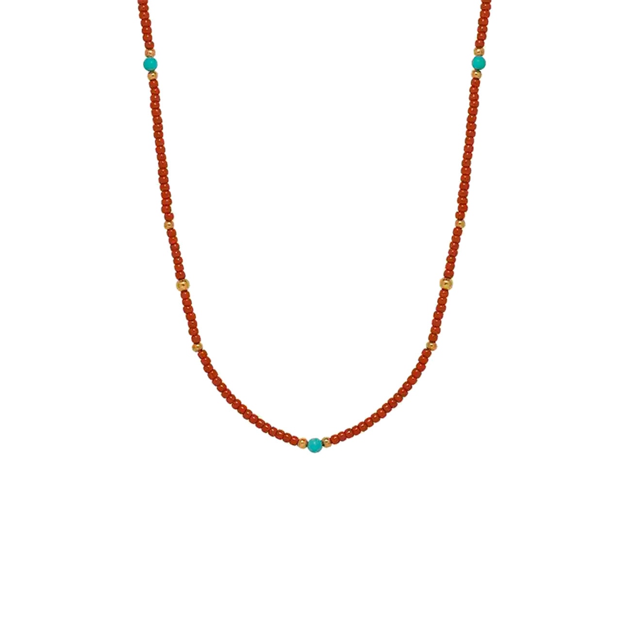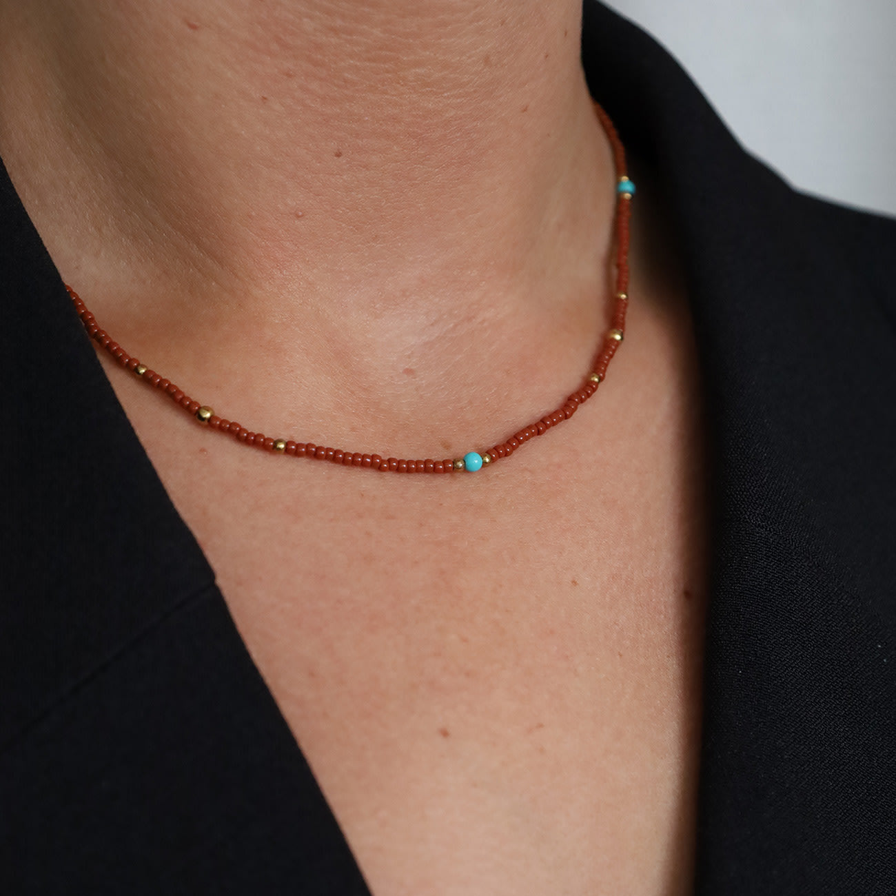 Turid er en brun halskæde med små blå og forgyldte detaljer. En elegant halskæde, som kan bruges til alle anledninger.